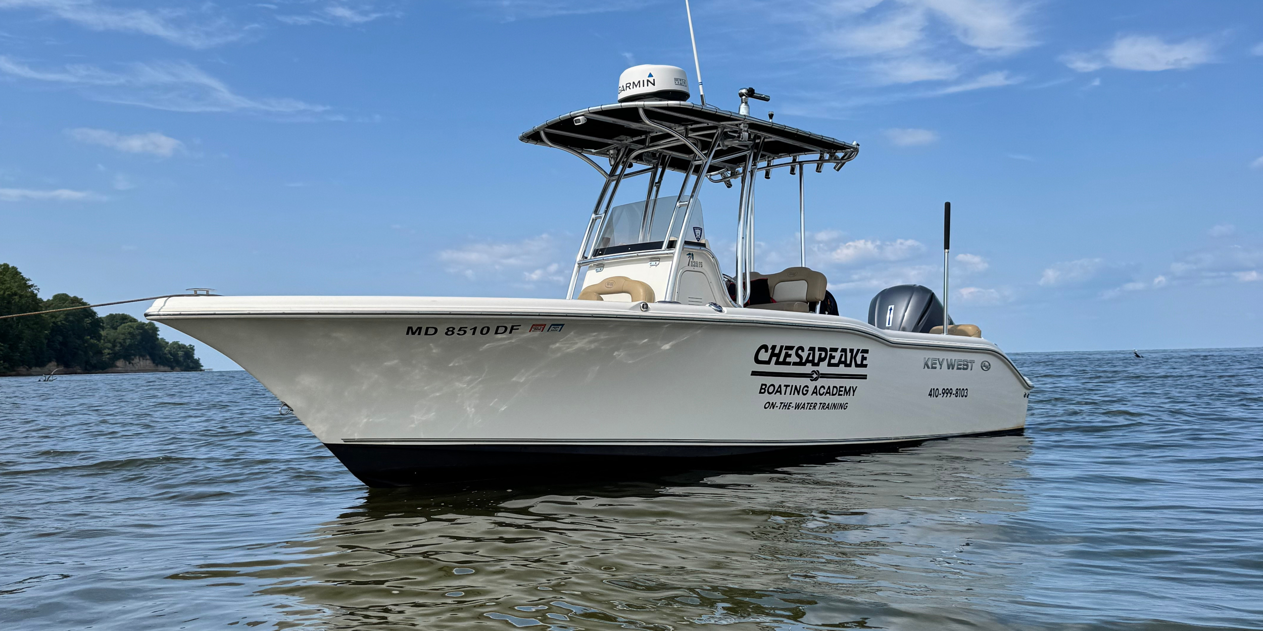 We use the Key West 239 FS as the training boat for both of our locations. We find this size, just shy of 24’ to be the ideal platform for instruction and learning. The center console set up allows the Captain to be on the side of the throttle. It is stable and easy to rotate students at the helm and there is a large bench seat in the back, seats in the front, dry storage in the console and many handrails and places to hold on. The Kent Narrows KW has Garmin Electronics and the Annapolis KW has Simrad Electronics. Both boats have VHF radios and extra safety gear for everyone aboard. The T-Top provides good sun coverage during the hot summer months. The boats have coolers to store drinks and food.